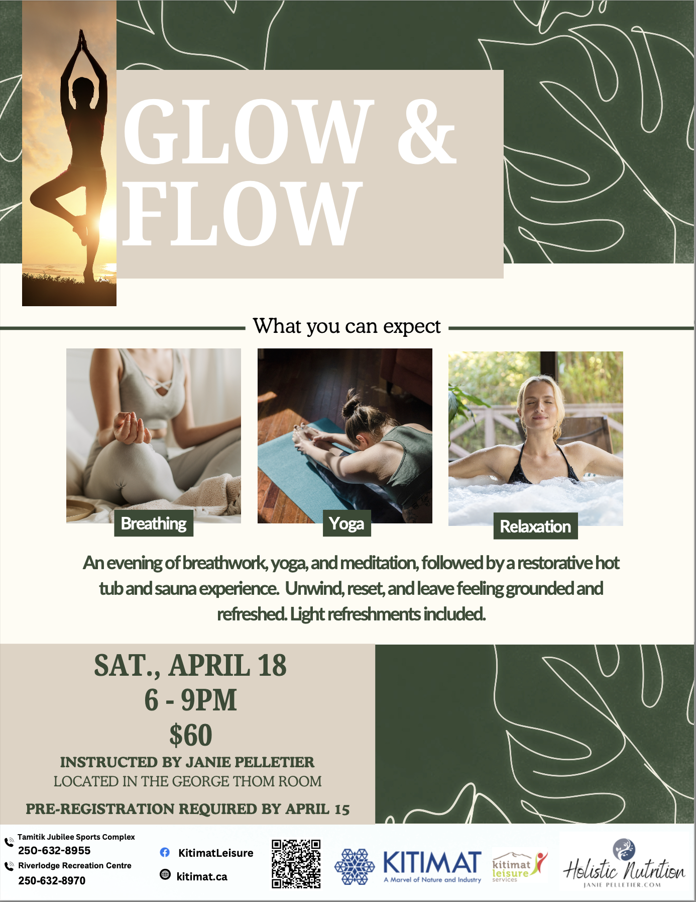 Finish the evening with a rejuvenating hot tub and sauna with epsom salt and essential oils. Learn how to manage stress through mindfulness practice and leave your session feeling grounded, recharged and glowing from the inside out! Light refreshments included.